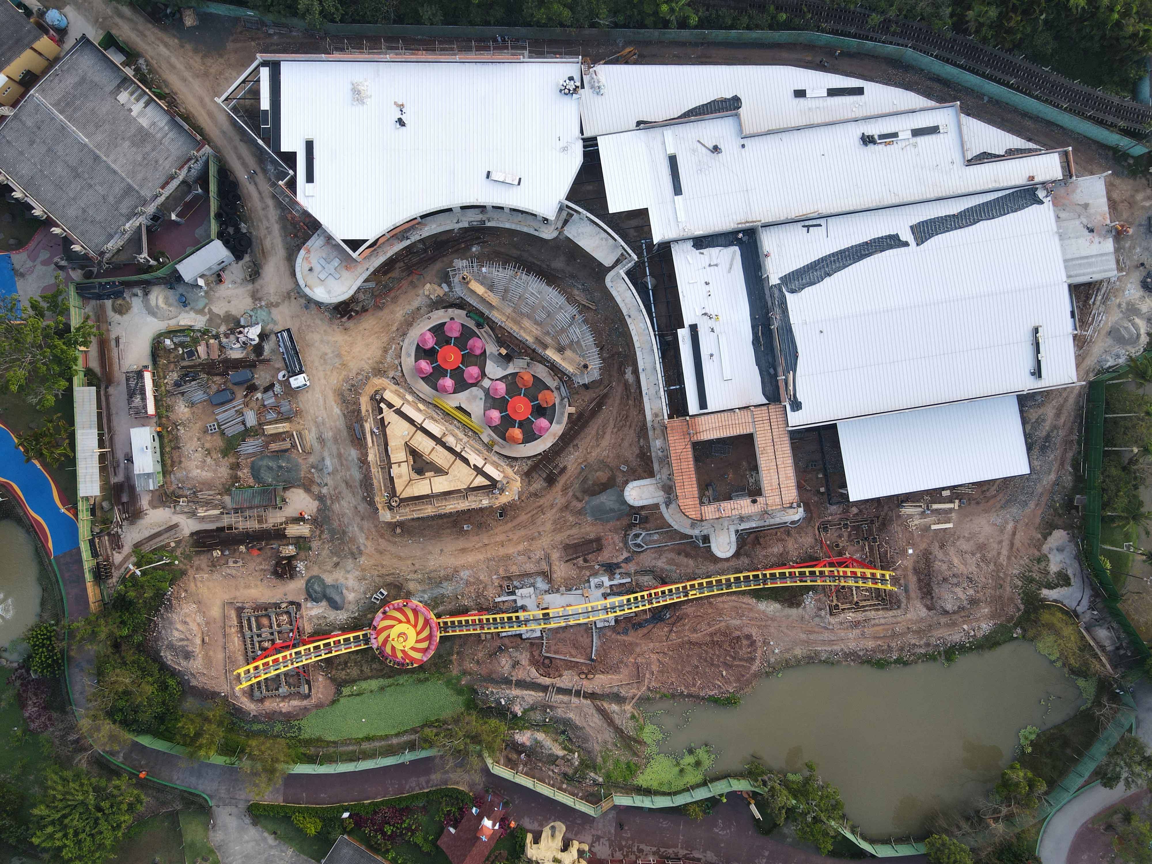 Ao lado direito do Disko Coaster conseguimos notar que as obras de escavação dos lagos no entorno da atração foi iniciado, além disso, os suportes do Disko Coaster foram protegidos com capas pretas, para evitar que prejudique a pintura da atração durante as escavações.
