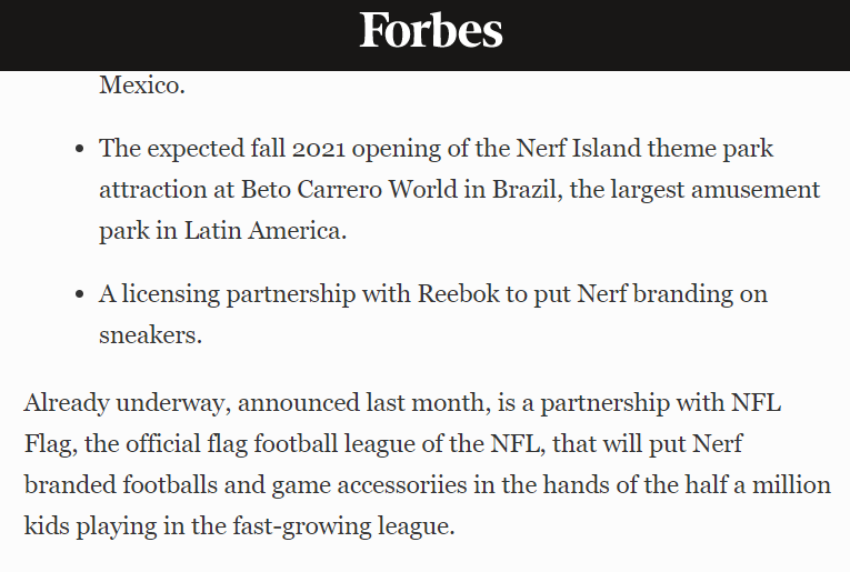 Em seguida, em uma matéria sobre a expansão e renovação da marca Nerf da Hasbro para a Forbes internacional, a empresa cita a parceria com o Beto Carrero World, revelando que a nova atração ou área temática será totalmente baseada na Nerf. Além disso, cita que a nova área será aberta no final de 2021.