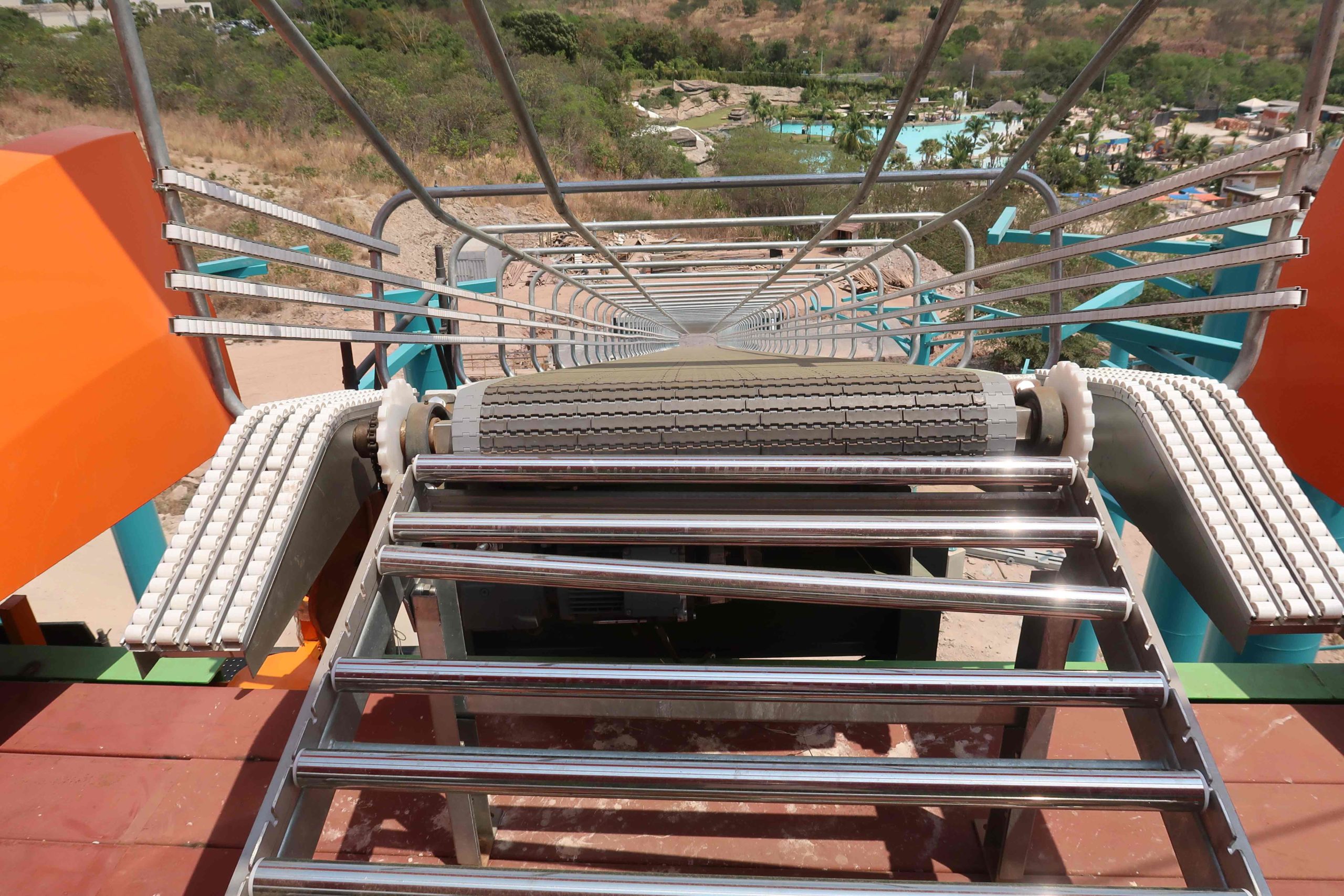 A esteira de elevação já está instalada, com isso os visitantes não precisarão carregar as boias até o topo da atração, elas já estarão posicionadas nos locais de saída.