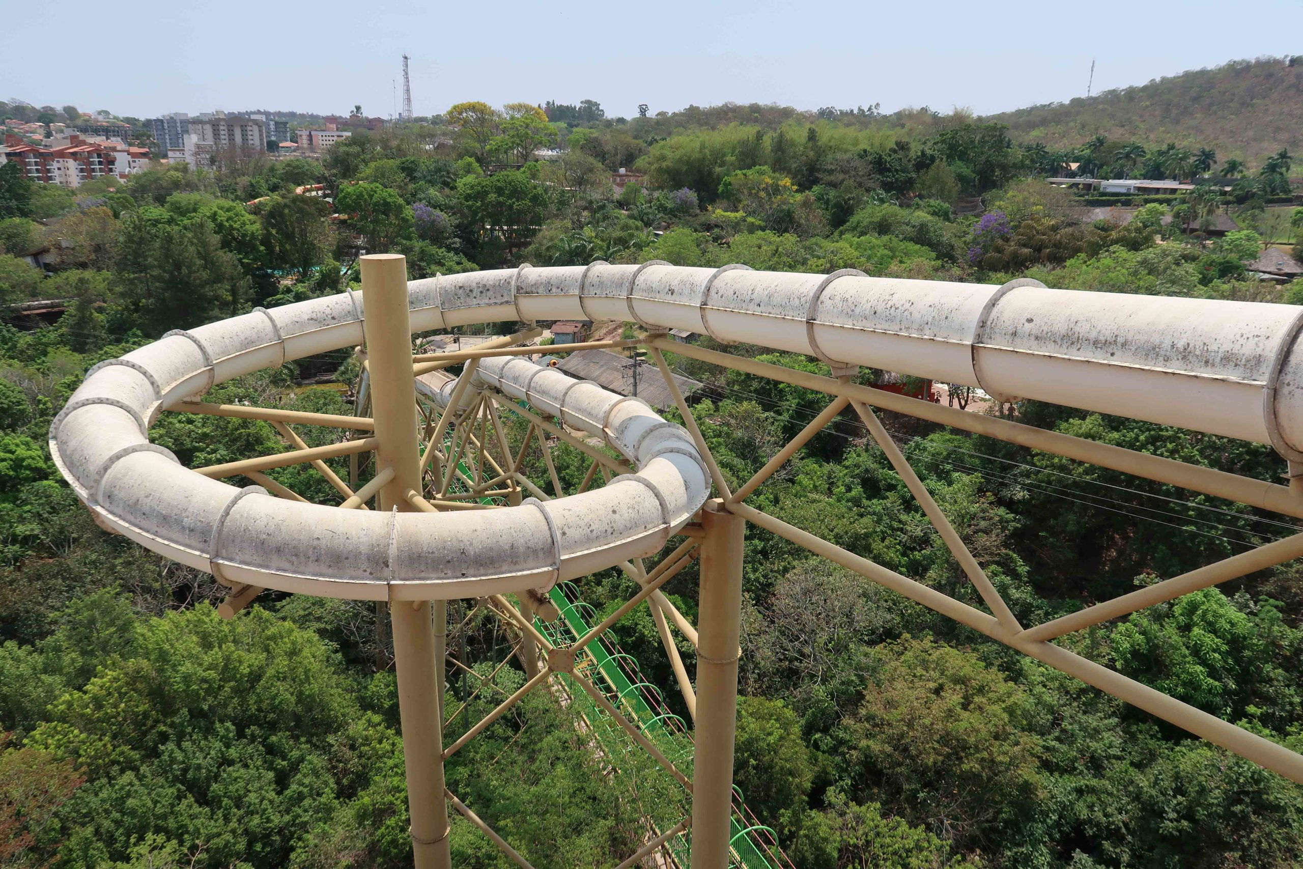 Já a torre dos futuros toboáguas está com sua construção bem avançada, sua estrutura, escadas e até as calhas de saída dos toboáguas já estão instalados. Inclusive sua tematização também começou, com suas cores externas amarelas com degrade transformado as cores para um tom laranja.